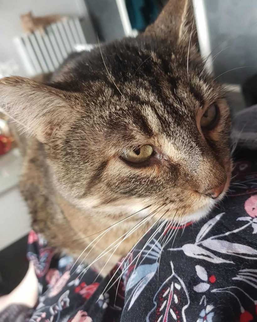 Chat abandonné, nous avons découvert par la suite que Jimmy a des plombs dans le corps et s’est donc fait tirer dessus. Il peut se montrer méfiant au premier abord, il suffit d’un peu de douceur pour gagner sa confiance.